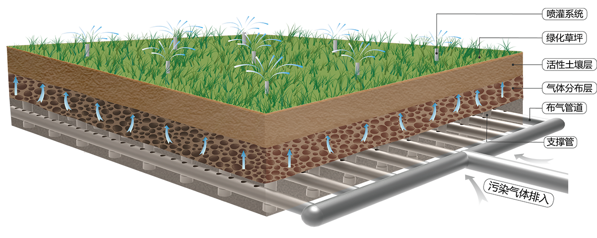 采用生物土壤為除臭介質(zhì),可緩慢釋放調(diào)節(jié)土壤PH值的礦物質(zhì),防止土壤酸化。